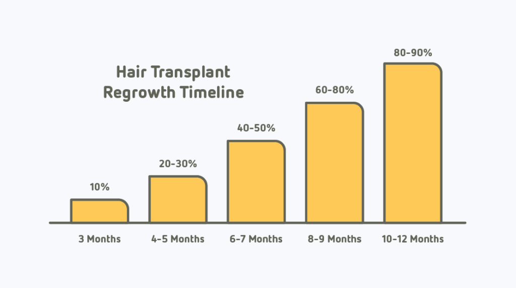 Na een haartransplantatie voelt de hoofdhuid in de eerste dagen gevoelig en week aan. Binnen twee tot drie weken vallen de meeste getransplanteerde haren tijdelijk uit, een normaal onderdeel van het herstelproces. Na ongeveer drie tot vier maanden begint de nieuwe haargroei zichtbaar te worden. Voor de meeste mensen is na zes maanden 40-50% van de haargroei zichtbaar, en het uiteindelijke resultaat wordt doorgaans na 12 maanden bereikt.